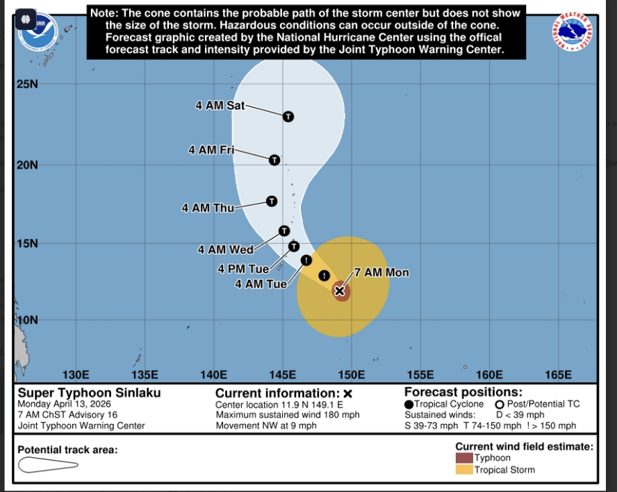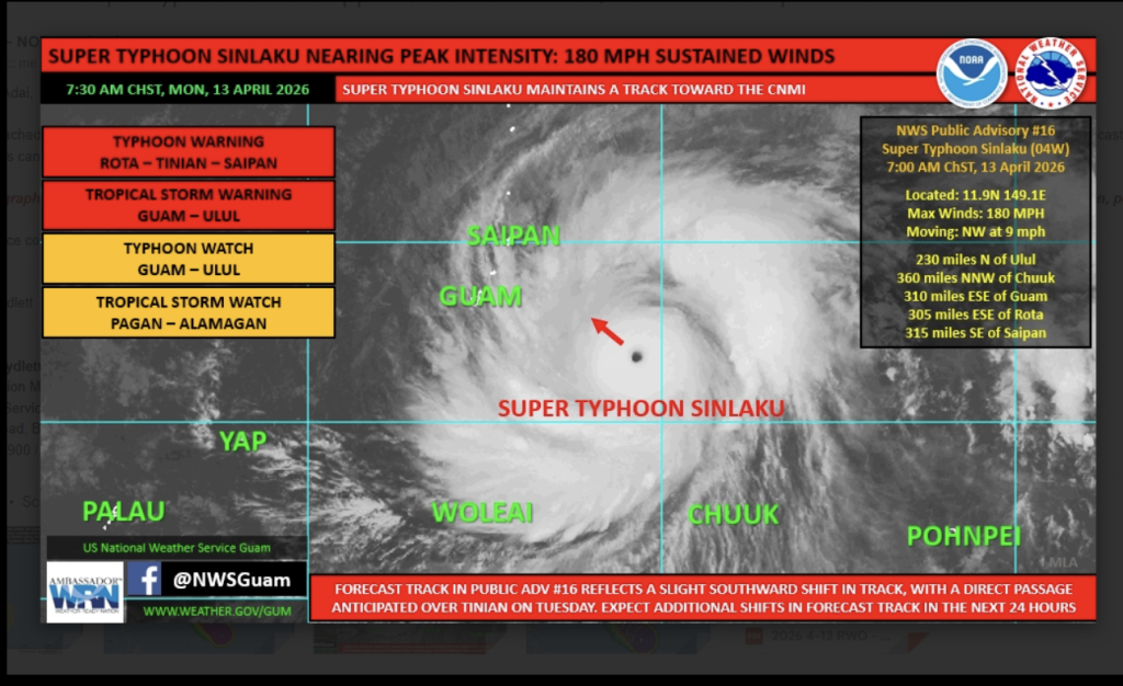 April 13, 2026, Federated States of Micronesia___President Simina has declared a State of Emergency for Chuuk State in the aftermath of Category 5 Super Typhoon Sinlaku, which is now headed towards Guam and the Commonwealth of the Northern Mariana Islands (CNMI) over the coming hours with winds of 30 to 40 miles per hour starting to be felt as of 4pm today (GMT+10).